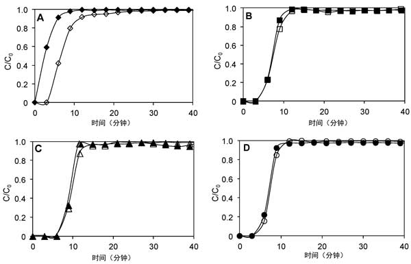 圖2:有無水分對(duì)乙烯吸附的影響:(A)未活化的活性炭,(B)活性炭,(C)浸漬氧化銅的活性炭,(D)氧氣氣氛中的活性炭。