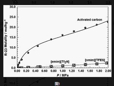 在活性炭上的吸附是選自顯著高于在離子液體中的溶解度 。在活性炭吸附的選自在2 MPa和298 K達到約22.7摩爾公斤−1而在離子液體的吸收達到約2.37摩爾公斤−1在2 MPa和298 K的活性炭具有一級吸附容量相對于離子液體。