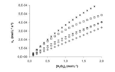 在圖4中溫度的效果示于初始反應(yīng)速率,這取決于過氧化氫的初始濃度時活性炭的質(zhì)量-體積比為2,00x10 -3克·毫升-1。
