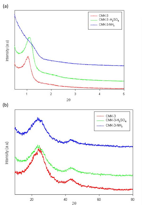 圖2、活性炭,活性炭-3-H 2 SO 4和活性炭-3-NH 3樣品的XRD圖譜:(a)低角度和(b)高角度XRD圖譜。