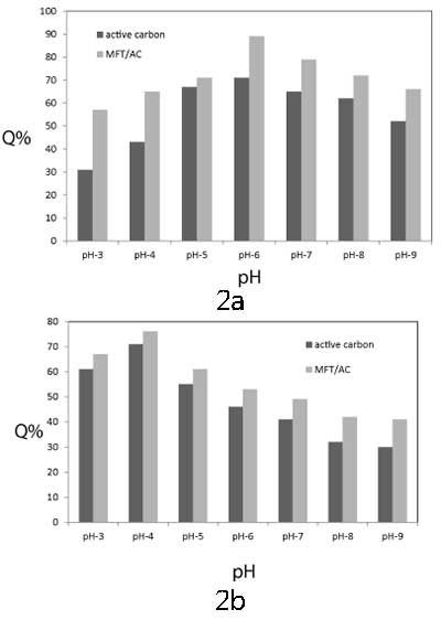 初始pH的影響:初始pH對(duì)鉻和鋅離子的去除效率的影響在pH(3-9)的范圍內(nèi)進(jìn)行研究,并在(圖2a和2b)中表示。通過(guò)在含有50mL初始濃度為100mg / L的50mL重金屬溶液的燒杯中,將0.05g MFT/活性炭或活性炭浸泡在25℃下,并且以210KHz聲強(qiáng)度,以7.7W /厘米1小時(shí)。如圖2所示,由于pH影響金屬離子和MFT官能團(tuán)的化學(xué)性質(zhì),MFT / 活性炭從水溶液中去除中的金屬離子是pH依賴性過(guò)程。在所有pH值范圍內(nèi),MFT / 活性炭的去除系數(shù)大于活性炭的去除系數(shù)。對(duì)于鉻離子,去除Cr 3+的系數(shù)離子從pH3增加到6,在pH6達(dá)到最大值。在pH = 6時(shí),約91%的鉻離子從溶液中去除。在pH范圍(7 - 9),去除系數(shù)略有下降。對(duì)于鋅離子,去除系數(shù)在pH4時(shí)達(dá)到最大值,鋅離子去除率達(dá)到74%,然后明顯下降。在中性或微酸性介質(zhì)中,吸收可能是由于樹(shù)脂 - 金屬離子絡(luò)合物的穩(wěn)定形成,由于配位羧酸根釋放H+,可能導(dǎo)致介質(zhì)酸度增加。在較高的pH值下,重金屬離子將水解成Cr(OH)+和Zn(OH)+,因此,重金屬正電荷減少到+1,這使得與螯合劑的低相互作用除了金屬氫氧化物可以沉淀。
