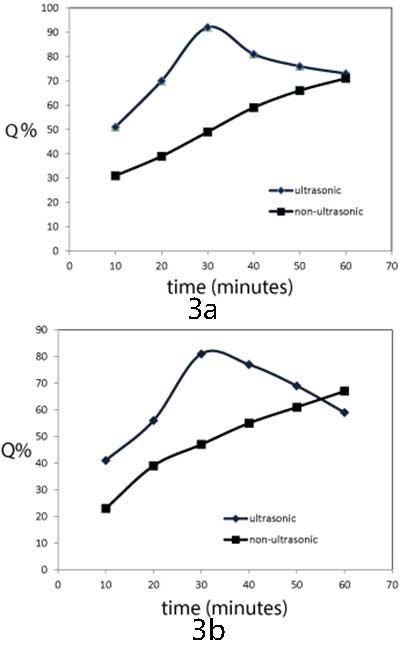 超聲處理時(shí)間對(duì)鉻和鋅離子的去除效率的影響通過(guò)在存在和不存在的情況下將0.05g MFT / 活性炭與50mL Cr 3+和Zn 2+溶液(100mg / L)頻率為210kHz的超聲波,聲強(qiáng)為7.7W / cm。結(jié)果如圖3a和3b所示。