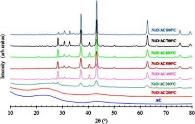 由活性炭和活性炭負(fù)載的鎳在不同的熱處理溫度下記錄的X射線衍射圖如圖1 所示。在200中被加熱的樣品 ℃,在2θ顯示有2個(gè)衍射峰 = 23.5和43.5°,對(duì)應(yīng)于(0 0 2),(1 0 無定形活性炭0)指數(shù)平面。另外,隨著煅燒溫度從300 ℃ 升高到800 ℃ ,反射次數(shù)增加,表明添加的催化劑在2θ = 37.1°,43.2°,62.7°和75.3° 處被氧化成氧化鎳 。這些角度分配給(1 1 1),(2 0 0),(2 2 0)和(3 1 1)面,立方晶體的氧化鎳。此外,對(duì)于400-800 ℃ 煅燒的樣品,在對(duì)應(yīng)于(2 2 2)的2θ = 79.3° 處觀察到新的峰。氧化鎳峰的強(qiáng)度也隨著煅燒溫度的增加而增加。
