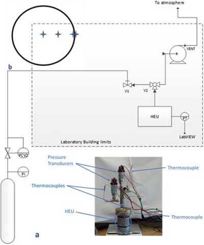使用設(shè)計為模擬自冷卻罐的換熱機組(HEU)為200mL容積的圓柱形容器進行實驗。該設(shè)備在圖1中示意性地示出; 參見圖1a中的照片。換熱機組(HEU)的主體由鋁制成,并用黃銅蓋封閉。水浴也是實驗裝置的一部分。