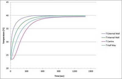 圖2、 當設(shè)備從環(huán)境條件轉(zhuǎn)移到40℃的水中時,床中和設(shè)備外表面上的溫度分布。