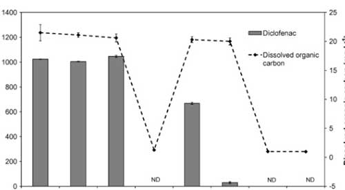 使用活性炭除去雙氯芬酸鈉是定性高效的,通過零吸收和低濃度的DOC的,并且在通過所獲得的色譜中沒有檢測到雙氯芬酸鈉。得在所研究的處理階段中,在活性炭上的吸附導(dǎo)致最顯著的雙氯芬酸鈉去除。因此,雙氯芬酸鈉沒有水樣中的這個階段(LOD之后檢測 = 2 μg L−1)?紤]到所述方法的定量限為3 μg L−1,通過活性炭除去雙氯芬酸鈉的至少99.7%。因為沒有研究活性炭的破裂曲線,所以活性炭的結(jié)果可以被認為是定性的。然而,為了研究在大型水處理廠中去除雙氯芬酸鈉,必須改進該方法以達到較低的檢測限(約μg L−1)。