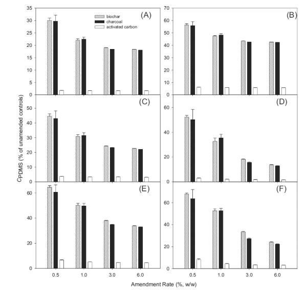在平衡時(shí),通過活性炭吸附或隔離PBDEs反映了它們在PDMS纖維(C PDMS)上檢測到的水平的變化。在JL沉積物中,隨著活性炭修正,C PDMS顯著下降,并且活性炭的類型之間的減少不同(圖2)。例如,當(dāng)用生物炭以0.5%修正JL沉積物時(shí),C PDMS降低至未沉降沉積物中的水平的30.0-67.8%。木炭(29.7-63.5%)的效果與生物炭相似(圖2)。相比之下,活性炭修正沉積物中C PDMS的下降幅度更大(圖2))。例如,在含有0.5%活性炭的JL沉淀物中,對(duì)于不同的同源物,C PDMS降低至未改良處理的水平的1.8-8.1%。平均而言,添加1.0%的活性炭導(dǎo)致所選BDE同系物的C PDMS降低至對(duì)照水平的1.7-5.9%,這表明活性炭在沉積物中螯合PBDEs的能力遠(yuǎn)遠(yuǎn)高于其他黑碳材料。