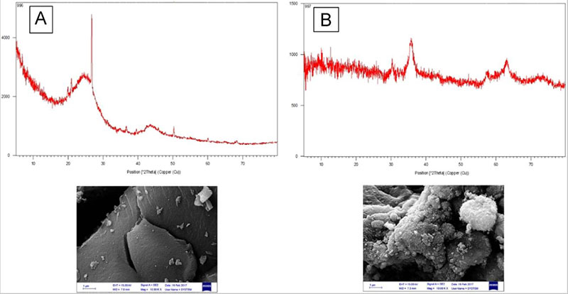 圖1:經(jīng)處理的活性炭(A)和氧化鐵活性炭納米復(fù)合材料(B)的XRD圖和SEM圖像。