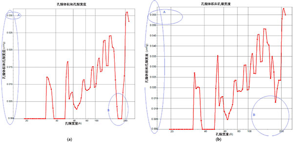 圖2.:(a)未經(jīng)預處理的活性炭(b)微波處理的活性炭增加孔體積與孔寬度的關系。