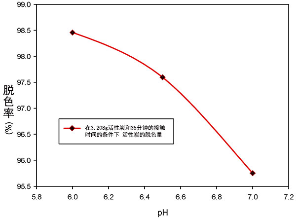 實驗過程中發(fā)現(xiàn),活性炭在較低的pH環(huán)境對顏色吸附效果得到大幅度增強。盡管如此,排放處理的酸性廢水的影響可能直接阻礙水生棲息地。鑒于此,使用預處理的活性炭吸附研究在6至7的可接受的pH范圍內進行?紤]的另外兩個因素是劑量和接觸時間,并且它們分別保持在3.208g和35min。從圖3中可以看出可以觀察到,顏色去除的百分比隨著pH的降低而增加。在pH6時獲得最高的顏色去除率98.46%,但隨著pH增加到7,顏色去除率降低到95.69%。