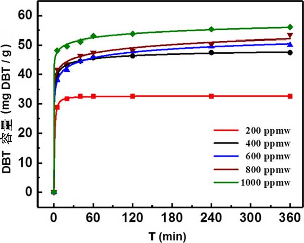 圖2.在不同硫初始濃度下活性炭對(duì)DBT的吸附容量。
