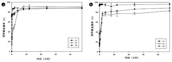 圖2:使用(a)活性炭和(b)改性活性炭對重金屬的吸附去除的影響。