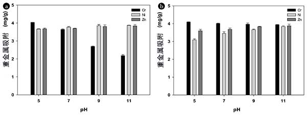 圖3:初始pH對Cr,Ni和Zn的吸附去除的影響使用。
