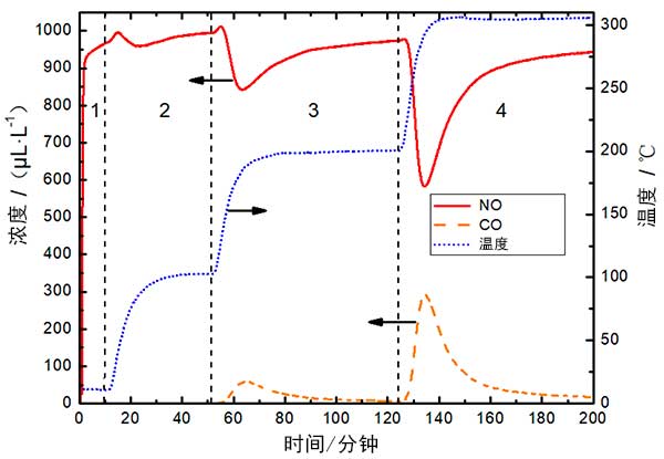 在加熱過程中,由于吸附的NO的部分解吸,出口NO將略微增加。然而,隨著溫度的升高,活性炭的化學(xué)吸附能力增加,化學(xué)吸附吸收更多的NO。因此,出口NO減少。當(dāng)溫度保持恒定時,活性炭表面上的吸附活化位點(diǎn)隨時間逐漸降低,導(dǎo)致出口處NO濃度增加。然而,隨著溫度從15℃逐漸升高到300℃,活性炭的催化能力增加,脫硝效率也增加。