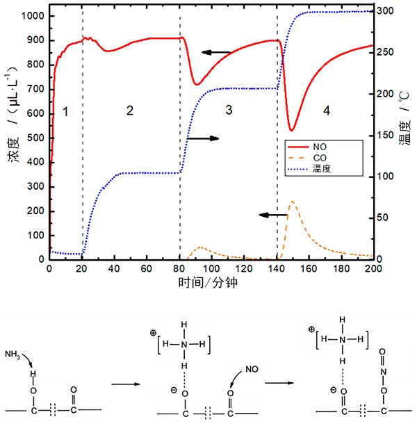 當(dāng)溫度低于300℃時,作為還原劑的活性炭的脫硝能力差。為了進(jìn)一步提高活性炭的脫硝能力,NH 3通常加入作為還原劑。如圖3所示,當(dāng)入口氣體為1000μL/ L NO +1000μL/ L NH 3時,研究了活性炭在不同溫度下的脫硝能力。本文使用的煤質(zhì)活性炭是酸性的,含酚羥基的官能團(tuán)相對較高,促進(jìn)了脫硝。它可以從之間的比較可以看出圖2和圖3中,加入NH后的趨勢和CO的濃度3基本上相同,而不NH 3,表明NH 3對含氧官能團(tuán)的分解沒有效果。