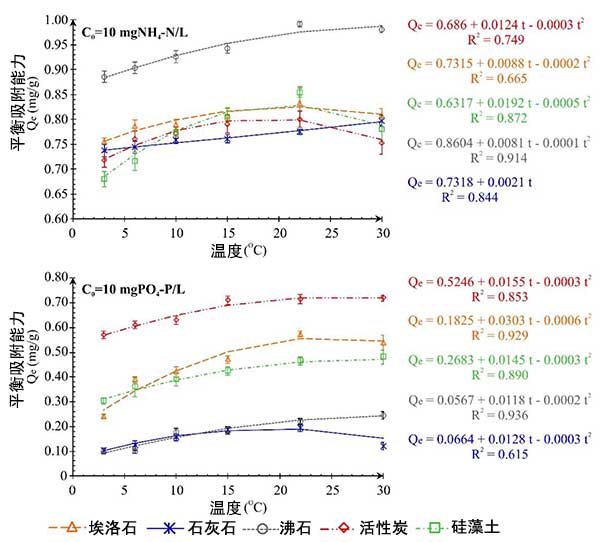銨和磷酸根離子的平衡試驗僅在3℃至22℃的溫度范圍內(nèi)進行,因此,吸附容量和溫度的關(guān)系沒有用多項式函數(shù)描述。類似地,如在系列I的分析中,活性炭對除去銨離子效果比較好,在磷酸鹽的情況下,具有高去除能力的材料是活性炭。