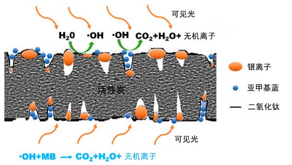 通過(guò)光催化降解再生活性炭具有很大的優(yōu)勢(shì),因?yàn)榕c其他再生工藝如熱和化學(xué)處理,微生物再生,電化學(xué)方法和超臨界萃取相比,它具有成本低,二次污染少的特點(diǎn)。此外,光催化再生可以通過(guò)同時(shí)進(jìn)行光催化降解和吸附來(lái)實(shí)現(xiàn)活性炭的自再生。二氧化鈦(TiO 2)是一種高效的光催化劑,通常固定在活性炭上進(jìn)行再生。然而,TiO 2的光催化降解部分受到限制,因?yàn)樗哂袃蓚(gè)固有特性:(1)具有大的帶隙,TiO 2僅吸收UV光子,其僅占太陽(yáng)光譜中能量的約5% ,(2)由于電荷載體的快速?gòu)?fù)合,TiO 2具有低的光催化活性。為了延長(zhǎng)光響應(yīng)區(qū)域,貴金屬被摻入TiO 2中,包括金,銀和鉑。與金和鉑相比銀具有抗菌活性和低成本,因此具有更廣泛的應(yīng)用領(lǐng)域。
