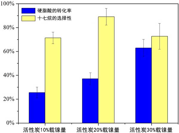結(jié)果發(fā)現(xiàn)制備的活性炭載鎳催化劑并表現(xiàn)出優(yōu)異的脫羧活性和維持。硬脂酸可在370℃下完全轉(zhuǎn)化5小時(shí),對(duì)十七烷的選擇性約為80%。過量的鎳顆粒可能會(huì)阻塞一定量的活性炭孔隙并減少孔隙體積。隨著高鎳負(fù)載量或催化劑負(fù)載量,裂解產(chǎn)物增加。溫度顯著影響硬脂酸的轉(zhuǎn)化,但不影響選擇性。具有大碳數(shù)的脂肪酸在活性炭反應(yīng)體系中易于裂化。