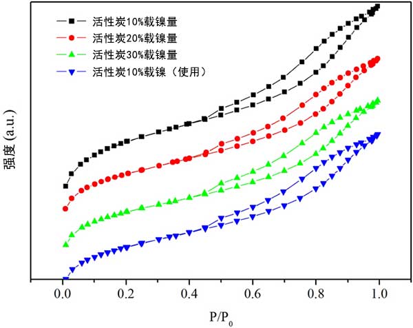 為了研究活性炭載鎳催化劑的可重復(fù)使用性,首先在真空下過濾分離先前實(shí)驗(yàn)的廢活性炭,然后用丙酮徹底洗滌,接著用水洗滌多次。然后將過濾的活性炭在強(qiáng)制通風(fēng)烘箱中在110℃下干燥,然后在管式爐中在氮?dú)饬飨略?00℃下煅燒4小時(shí)。經(jīng)過從新活化的活性炭的測(cè)試,活性炭對(duì)硬脂酸的產(chǎn)率和選擇性轉(zhuǎn)化為十七烷在重復(fù)三次催化后性能幾乎沒有下降。選擇性保持在約90%,在無溶劑體系中保持穩(wěn)定。活性炭的N2吸附-脫附等溫線如圖3所示,表明隨著鎳負(fù)載量的增加,活性炭的表面積和孔體積減小,表明過量的鎳顆?赡茏枞欢康幕钚蕴靠撞p少孔體積。
