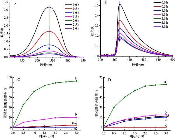 亞硝酸鹽和氨的記錄的紫外可見(jiàn)吸收光譜分別在圖3中。圖3AB明確顯示當(dāng)活性炭用作光催化劑時(shí),在厭氧條件下,亞硝酸鹽和氨的濃度與輻照時(shí)間同時(shí)下降。對(duì)照試驗(yàn)也在活性炭催化劑存在或不存在下進(jìn)行,照射或在黑暗中或不存在一種組分時(shí)進(jìn),亞硝酸鹽和氨的去除率如圖3CD所示。在活性炭鋅鐵氧體照射下,氨降解的平均去除率達(dá)到64.3%,而在沒(méi)有活性炭的情況下去除率僅為18.8%。結(jié)果明顯的是的活性炭鋅鐵氧體具有同時(shí)去除亞硝酸鹽和氨的光催化功能。