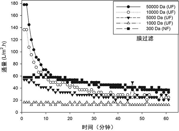 在膜過(guò)濾測(cè)試中,使用四個(gè)UF膜和一個(gè)NF膜。研究了1小時(shí)的通量變化,并監(jiān)測(cè)了降低的通量。在UF膜觀察到較高的通量降低。過(guò)濾1小時(shí)后,隨著截留分子量從50,000 Da減少到1,000 Da,通量下降也減少了。對(duì)于10,000 Da UF膜,在初始通量1小時(shí)過(guò)濾后損失了82%的通量。1,000 Da UF膜顯示出較低的通量在圖2顯示?讖绞怯绊懩み^(guò)濾通量的最重要參數(shù)之一,也是影響活性炭吸附能力的參數(shù)。通量也受膜結(jié)構(gòu),水中成分和廢水pH的影響。有些膜有很高的同量主要是由于膜表面與廢水成分之間的靜電相互作用。