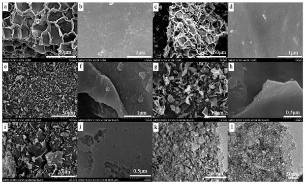 通過SEM和TEM研究了空氣氧化前后活性炭的微觀結(jié)構(gòu)(圖2)。在(圖2a,b)中,軟木材料呈蜂窩狀結(jié)構(gòu)并具有明顯的褶皺。在800℃碳化后,保留結(jié)構(gòu)并且包含該結(jié)構(gòu)的部分彼此緊密結(jié)合,看起來光滑(圖2c,d)。在350℃-450℃下空氣活化后,結(jié)構(gòu)單元被分離形成薄片(圖2e),這可歸因于細(xì)胞之間木質(zhì)素的降解。活性炭呈現(xiàn)出層狀空氣氧化后的結(jié)構(gòu)(圖2的e-j)的。350℃和400℃活化的活性炭樣品表面相對(duì)光滑,在0.5-1μm的分辨率下未觀察到明顯的孔結(jié)構(gòu)(圖2f,h)。當(dāng)氧化溫度升至450℃時(shí),活性炭的表面顯著變化并觀察到大量的孔。圖2j顯示450℃活化樣品顯示出具有裂縫和空隙的粗糙表面。TEM結(jié)果(圖2k,i)顯示450℃活化的活性炭具有三維(3D)互連框架的分級(jí)微/中孔結(jié)構(gòu)。這些孔可以有助于廢水中染料的吸附。