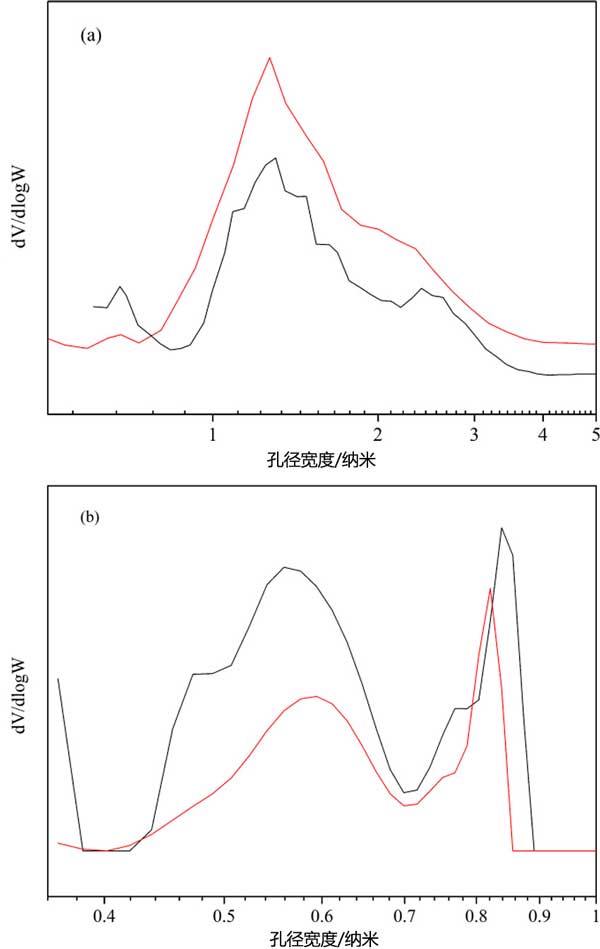 圖4:(a)在-196℃下記錄的氮吸附數(shù)據(jù)和(b)在0℃下記錄的二氧化碳吸附數(shù)據(jù)計(jì)算的活性炭孔徑分布。