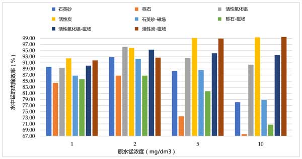在最后一系列試驗中,作為所進行的工作的一部分,使用錳模型溶液進行試驗。在計算的基礎上,發(fā)現(xiàn)在通過活性炭的過濾過程中用磁場處理的樣品中錳的去除效率更高。各濾床上錳和對照水之間的錳去除效率差異(圖3)。另一方面,磁場的使用增加了水的飽和度,其中氧氣是Mn(II)氧化反應為Mn(IV)所必需的。其他吸附材料具有化學惰性,因此通過使用磁場對水的物理和化學性質的影響不會提高鐵和錳離子的效率。