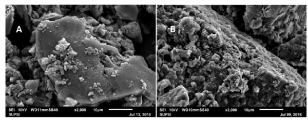 圖2:活性炭表面的掃描電子顯微照片。(A)使用前(B)在溶氣浮選裝置單元中30分鐘后。