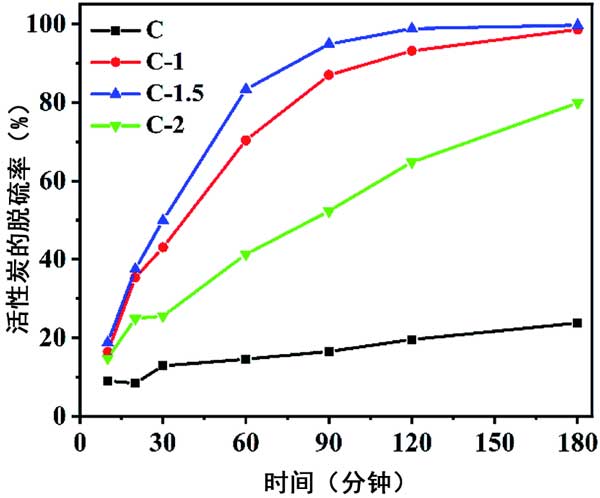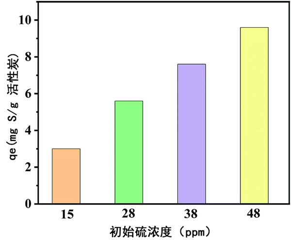 基于以上結(jié)構(gòu)表征和實驗結(jié)果,得出了吸附機理。戊硫醇分子中的強路易斯酸S原子與活性炭中來自氧原子的一對電子相互作用。大孔和中孔的存在有助于活性炭的比表面積增加,暴露出更多的內(nèi)部原子,并促進(jìn)了質(zhì)量傳遞,從而使吸附劑易于與硫化物接觸。關(guān)于炭1.5的工業(yè)應(yīng)用前景,考慮了硫的初始濃度對吸附性能的影響。如圖3所示,對于初始含硫量分別為15、28、38和48 ppm的模型燃料,炭1.5的平衡吸附容量為每克吸附劑3.0、5.6、7.6和9.6 mgS。值得注意的是,在此濃度范圍內(nèi),吸附劑的硫去除率高于97%。這組結(jié)果表明該材料對于去除低濃度的硫化物具有明顯的工業(yè)應(yīng)用價值。