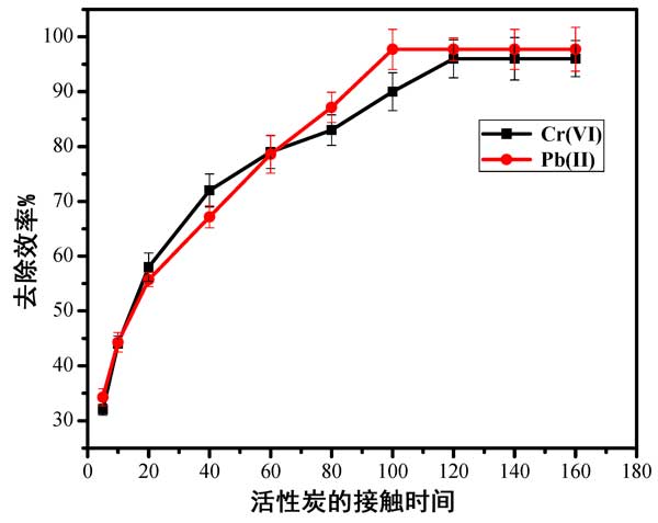 圖4:時(shí)間對(duì)活性炭上鉛(II)和鉻(VI)離子去除效率的影響。