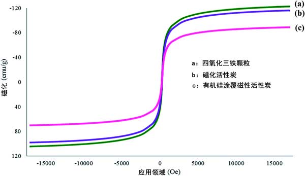 在這項(xiàng)研究中使用VSM來檢查合成活性炭的磁強(qiáng)度。對Fe 3 O 4顆粒,磁性活性炭和機(jī)硅涂覆磁性活性炭進(jìn)行了研究,以研究它們在涂覆時(shí)的磁強(qiáng)度趨勢。幾種材料的磁滯回線分別示于圖1(a)-(c)。根據(jù)獲得的結(jié)果。由于存在非磁性活性炭和有機(jī)硅表面活性劑涂層,磁強(qiáng)度似乎下降了。這確認(rèn)涂覆過程成功。但是,盡管在涂覆最終材料機(jī)硅涂覆磁性活性炭時(shí)磁化強(qiáng)度降低,但其磁強(qiáng)度仍在可接受的范圍內(nèi),并且強(qiáng)度足以在吸附過程中進(jìn)行。