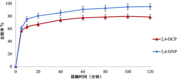 圖3:接觸時(shí)間對去除2,4-DNP和2,4-DCP的影響。