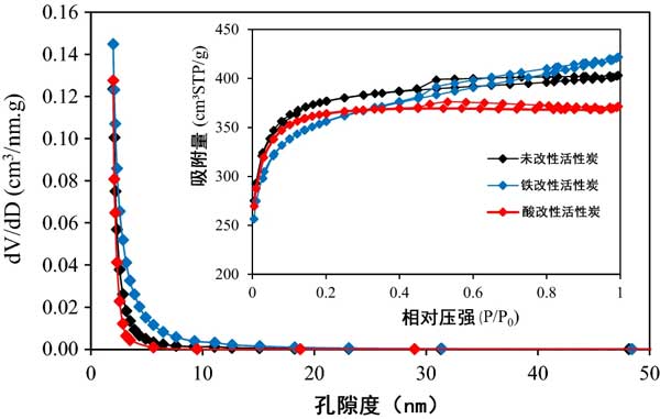 圖1顯示了活性炭纖維的孔徑分布。如圖1所示,活性炭纖維的孔徑在1至20nm之間。同時,幾種活性炭的所有氮吸附/解吸曲線均與IV型吸附等溫線相對應(yīng)。由于活性炭內(nèi)中孔定義為2–50 nm,在未經(jīng)改性和經(jīng)過改性的活性炭是微孔的,但HNO 3改性擴大了孔的結(jié)構(gòu)并導致了中孔的結(jié)構(gòu)。因此,活性炭顯示出微孔/中孔結(jié)構(gòu)特征,并且可以用作在水中吸附砷離子的有前途的材料。