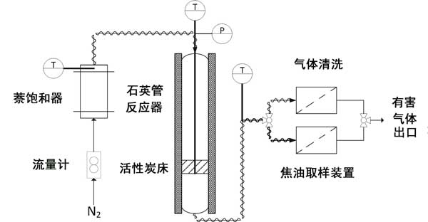 萘轉(zhuǎn)化試驗已在圖1所示的實驗設(shè)備中進(jìn)行,該設(shè)備顯示了其主要部分:進(jìn)料系統(tǒng),反應(yīng)器,采樣/清潔裝置和氣體分析儀。進(jìn)料系統(tǒng)由用于調(diào)節(jié)氮氣流量的轉(zhuǎn)子流量計和萘飽和器組成,以獲取摻有焦油的物流。飽和器和反應(yīng)器之間的管道應(yīng)保持在150°C以上,以免萘發(fā)生冷凝。所使用的反應(yīng)器是內(nèi)徑為14 mm,總高度為600 mm的立式管狀石英反應(yīng)器。將活性炭床放在反應(yīng)器內(nèi)部的玻璃粉上方,該玻璃粉位于距頂部430毫米處。床的溫度通過K型熱電偶在床的中央進(jìn)行測定。在焦油采樣期間,通過切換三通閥,將反應(yīng)器出口處的氣體導(dǎo)入采樣裝置,并在其余時間內(nèi)導(dǎo)入清潔裝置。采樣裝置由三個撞擊器組成,在0°C時充滿異丙醇。專用實驗表明,在本研究分析的條件下,該設(shè)備的捕獲效率超過99%。借助帶有熱導(dǎo)檢測器(TCD)的微型氣相色譜儀分析清潔區(qū)出口處的氣體,以在線測定短鏈烴(從乙炔到苯)和分子氫。實驗裝置的更多詳細(xì)信息可以在其他地方找到。