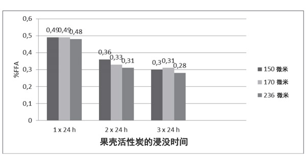 活性炭浸入進(jìn)行1、2或3天。從圖中可以看出,浸泡1天的FFA值在0.4-0.5%的范圍內(nèi)。浸泡兩天的FFA范圍不同(0.3-0.4%)。此外,浸泡3天的油中FFA很低,為0.2-0.3%。根據(jù)這項(xiàng)研究,發(fā)現(xiàn)活性炭可降低食用油的FFA。重要的是要強(qiáng)調(diào)指出,使用農(nóng)業(yè)廢料制成活性炭來(lái)處理水性廢水(主要作為替代性吸附材料)可能是一個(gè)優(yōu)勢(shì),因?yàn)樗鼈兛梢匀コ龔U水中的惰性污染物,并且可以很大程度地減少因不適當(dāng)處理這些廢水而造成的環(huán)境影響。