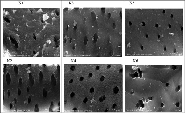 對原始活性炭(圖3中的K1)的掃描顯示出相當均勻的孔;钚蕴康慕Y構可以看作是薄片,為不規(guī)則分布和各種尺寸的孔提供了較大的吸附面積。表面上的大多數(shù)可見孔都在5微米范圍內(nèi),這與對椰殼活性炭的預期一致,而在這5微米孔內(nèi)可以看到小于1微米的較小孔。圖3中的K2顯示了在氯酸鹽吸附到表面活性部位后活性炭表面的變化。這些孔有變化的跡象,因為其中一些吸附氯酸鹽,而其他孔被氯酸鹽和氯化物分子阻塞。在10,000倍的放大倍率下,可以觀察到小孔周圍和大孔入口處的沉積,因為預計表面活性基團會大量存在于這些區(qū)域;钚蕴康乃嵝栽偕鷺O有可能形成了表面活性部位,從而增強了活性炭吸附大量氯酸鹽的能力。