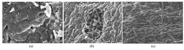 圖1:SEM分析:(a)一般活性炭,(b)活化活性炭,和(c)吸附后的活性炭。