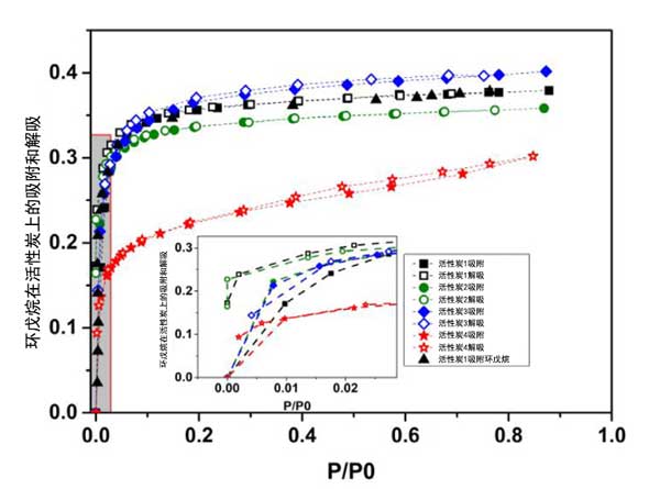 四種活性炭的吸附容量與它們的孔體積直接相關(guān),較高的孔體積導(dǎo)致較高的吸附容量。微孔活性炭對環(huán)戊烷吸附等溫線的比較清楚地表明,即使可以預(yù)料到由于顆粒大小和孔體積,顆粒大小也不會顯著影響環(huán)戊烷吸附能力。