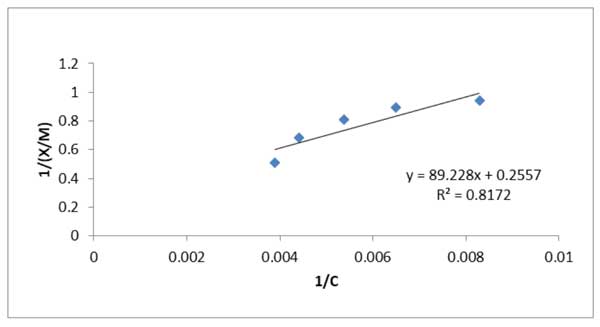 通過(guò)將實(shí)驗(yàn)數(shù)據(jù)擬合到Langmuir和Freundlich等溫線(xiàn),完成了吸附脫硫過(guò)程的平衡表征。吸附等溫線(xiàn)表明,隨著溶液中平衡濃度的增加,硫的吸附量增加。應(yīng)用Langmuir和Freundlich模型方程對(duì)硫的吸附等溫線(xiàn)進(jìn)行了分析。1/n值表示良好的吸附Freundlich模型比Langmuir模型(R2=0.817)擬合效果更好(R2=0.831)。