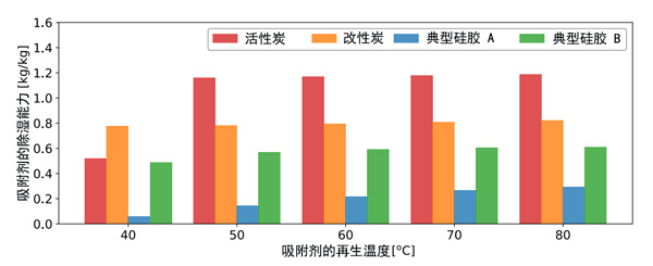 活性炭的除濕能力可以定義為在給定溫度和濕度條件下的有效吸附量,其計(jì)算方式為吸附與解吸之間的平衡吸附之差?紤]到實(shí)際環(huán)境條件,相當(dāng)于室外空氣條件的吸附條件為干球溫度為32℃,相對(duì)濕度為80%。解吸條件是由再生空氣溫度從40℃到80℃給出的,室外空氣條件下的濕度比為24g/kg。計(jì)算出的除濕能力如圖1所示。比較了活性炭和典型硅膠(A型和B型硅膠)在不同再生溫度下的除濕能力。在硅膠的情況下,由于缺乏數(shù)據(jù),吸附和解吸之間的磁滯被忽略了,并且預(yù)期它很小。