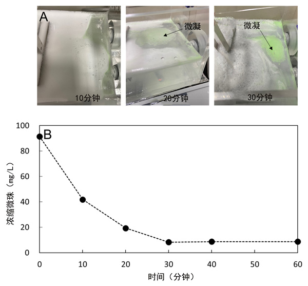圖3:電凝實(shí)驗(yàn)的結(jié)果:(A)微珠聚集的過程,(B)隨著時(shí)間的流逝通過離心濃縮不可分離的微珠。每個(gè)數(shù)據(jù)點(diǎn)都是重復(fù)實(shí)驗(yàn)的平均值。