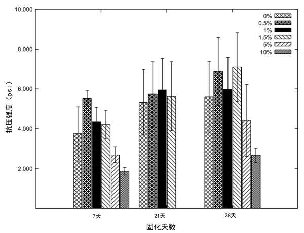 在7天,21天和28天測量立方體樣品的抗壓強度。每個代表性的抗壓強度是十二個樣品的平均值。強度的測量是使用混凝土壓縮機進行的。根據抗壓強度試驗結果,由于在7天時測得的強度大大降低,因此未測試21天時5%和10%活性炭的樣品。結果證明,普通水泥砂漿的抗壓強度隨養(yǎng)護時間的增加而增加。在活性炭復合材料樣品中也觀察到了相同的趨勢。沒有活性炭的水泥砂漿的7天強度達到28天強度的66%,而0.5%和1%活性炭復合材料的7天強度分別達到28天強度的80%和73%。這意味著低濃度的活性炭可能會加速強度硬化過程。等于或大于1.5%的過量濃度消除了早期強度效應。此外,活性炭的過量含量大于5%導致強度顯著降低。添加5%的活性炭會使普通水泥砂漿的7天抗壓強度降低28%,而28天抗壓強度降低21%。添加10%會使7天強度下降50%,而28天強度下降52%。這些結果表明,大于合適范圍的活性炭的摻入會損害普通水泥的強度。在該研究中,觀察到增加抗壓強度的合適含量范圍為0.5%至1.5%。