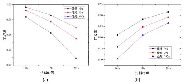 活性炭?jī)艋瘯r(shí)間的影響如圖2所示。當(dāng)吹掃時(shí)間從40秒增加到70秒時(shí),氫氣純度提高了0.44–1.35%,氫氣回收率降低了2.61–6.57%。當(dāng)吹掃時(shí)間從70秒增加到100秒時(shí),氫氣純度提高了0.21-0.76%,氫氣回收率降低了2.91-7.19%。隨著吹掃時(shí)間的增加,在吹掃步驟中氫氣的摩爾分?jǐn)?shù)增加,因?yàn)楦嗟牟患儦怏w從吸附劑中解吸出來。因此,隨著吸附劑的循環(huán)利用,這些雜質(zhì)的摩爾分?jǐn)?shù)降低,因此隨著凈化時(shí)間的增加,氫純度也隨之提高。但是回收率下降了,當(dāng)進(jìn)料時(shí)間短并且吹掃時(shí)間增加時(shí),氫純度變化率降低,并且氫回收率變化率增加。